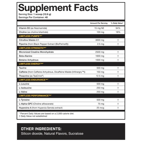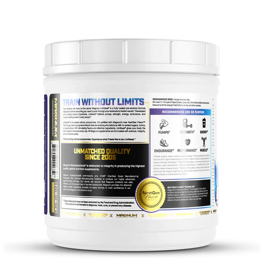 Magnum Limitless is designed for anyone who wants a high-quality, complete pre-workout supplement without compromising on formula or flavor. Limitless provides over 20 grams of active ingredients in every two-scoop serving.