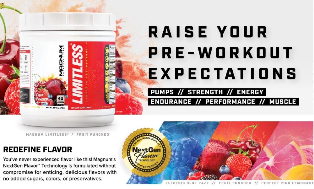 Magnum Limitless is a fully-loaded, all-in-one pre-workout formula designed to deliver everything you need to push through your workouts so you can achieve results like never before. Complete with a brand new flavoring system, Limitless provides over 20 grams of scientifically proven, active ingredients so you can reach your goals and unleash your true potential.