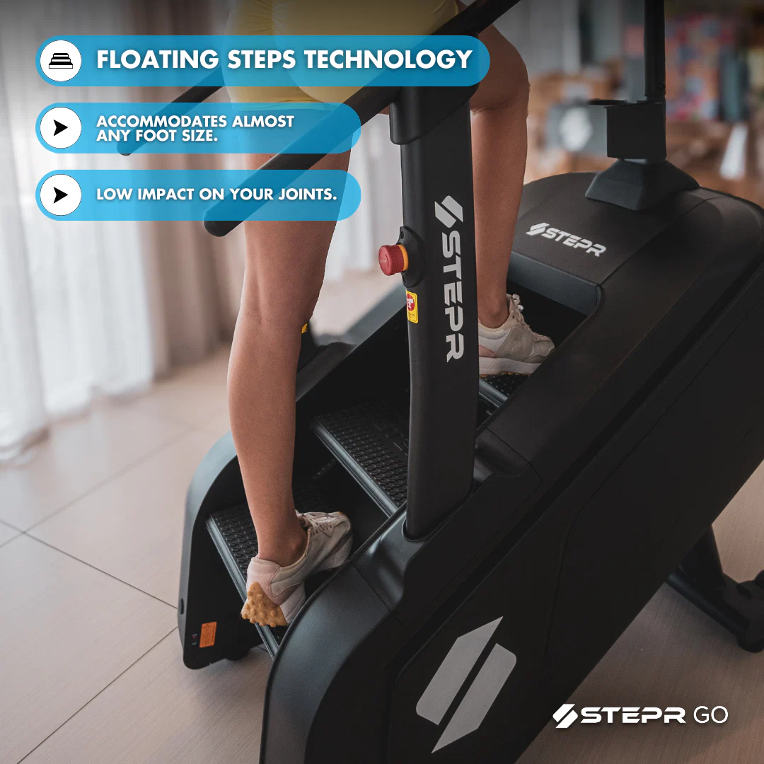 The STEPR GO is our ‘Get on & Go’ Home Stair Climbing Solution. True to STEPR’s space-saving design and compact footprint allowing the STEPR GO to fit in almost any indoor environment. It fits through standard doorways and only requires 8ft ceilings. With our floating Stadium Step design accommodating almost any foot size, it’s versatile enough for beginners and the most advanced fitness levels.